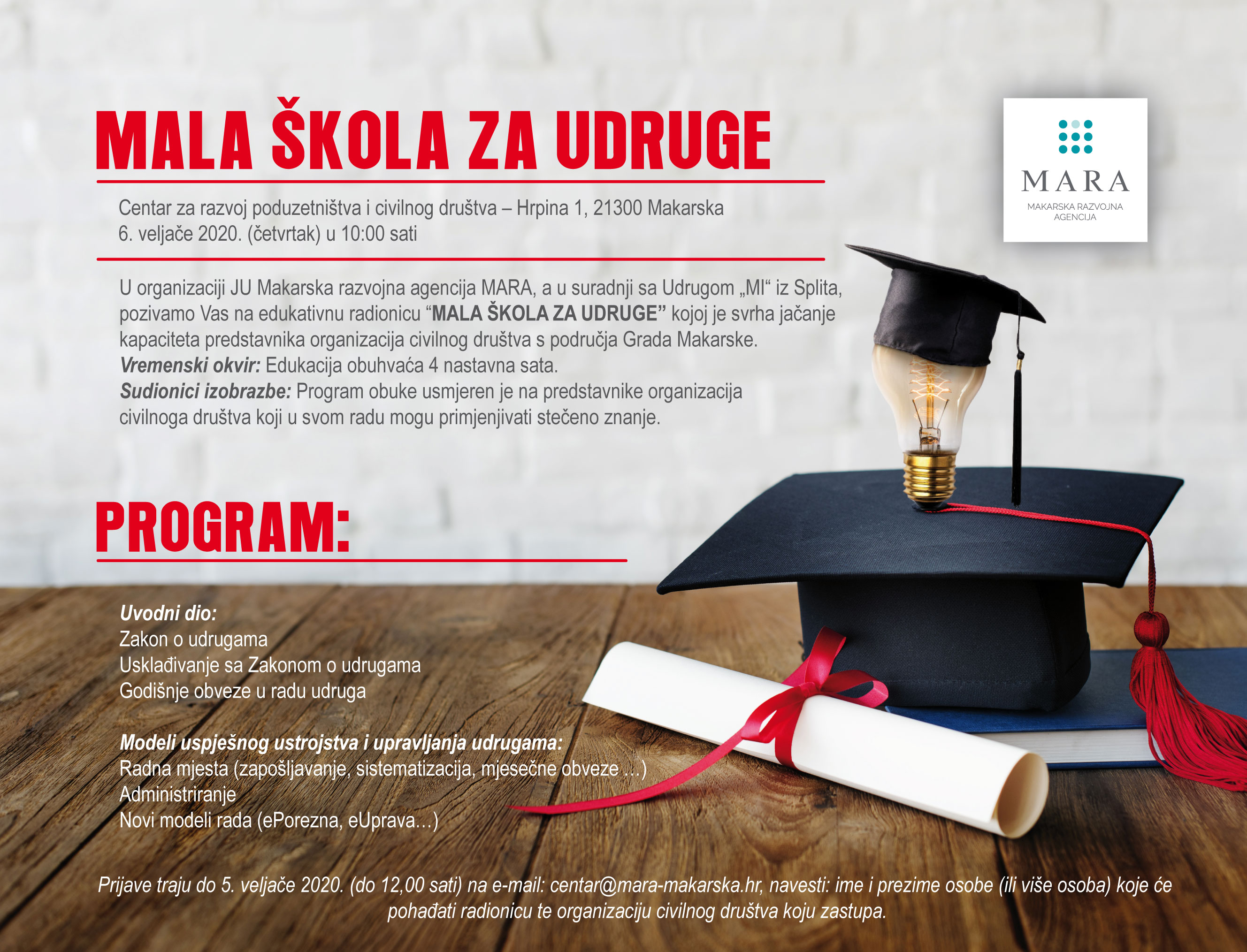 U organizaciji JU Makarska razvojna agencija MARA, a u suradnji sa Udrugom „MI“ iz Splita, pozivamo Vas na edukativnu radionicu MALA ŠKOLA ZA UDRUGE kojoj je svrha jačanje kapaciteta predstavnika organizacija civilnog društva s područja Grada Makarske.