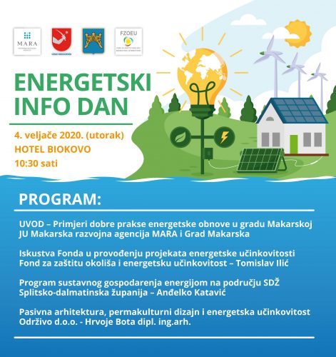 U utorak 4. veljače 2020. u hotelu Biokovo, s početkom u 10,30 sati održat će se ENERGETSKI INFO DAN u organizaciji JU Makarska razvojna agencija MARA i Grada Makarske, a u suradnji sa Fondom za zaštitu okoliša i energetsku učinkovitost i Splitsko-dalmatinskom županijom.