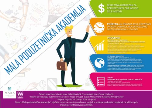26. travnja započinje pilot projekt “Mala poduzetnička akademija”, u organizaciji JU Makarska razvojna agencija MARA, u suradnji sa Turističkom zajednicom. Cilj edukacije je pružiti polaznicima osnovna znanja potrebna za uspješno vođenje poduzeća i opstanak na tržištu, osigurati osnovna znanja za vlastiti razvoj i napredak. Program obrazovanja se sastoji od osnovnog i specijalističkog dijela seminara, podijeljenih u dva ciklusa. Nakon provedene obuke svaki polaznik dobit će uvjerenje o završenoj edukaciji. Voditelji seminara su iskusni stručnjaci Jurica Dobrnić, dipl. oec. i dr. sc. Neven Šerić. Izobrazba je besplatna, a započinje 26. travnja 2018. Prijave se zaprimaju putem obrasca na web stranicama MARA-e: http://mara-makarska.hr/vazni-akti/